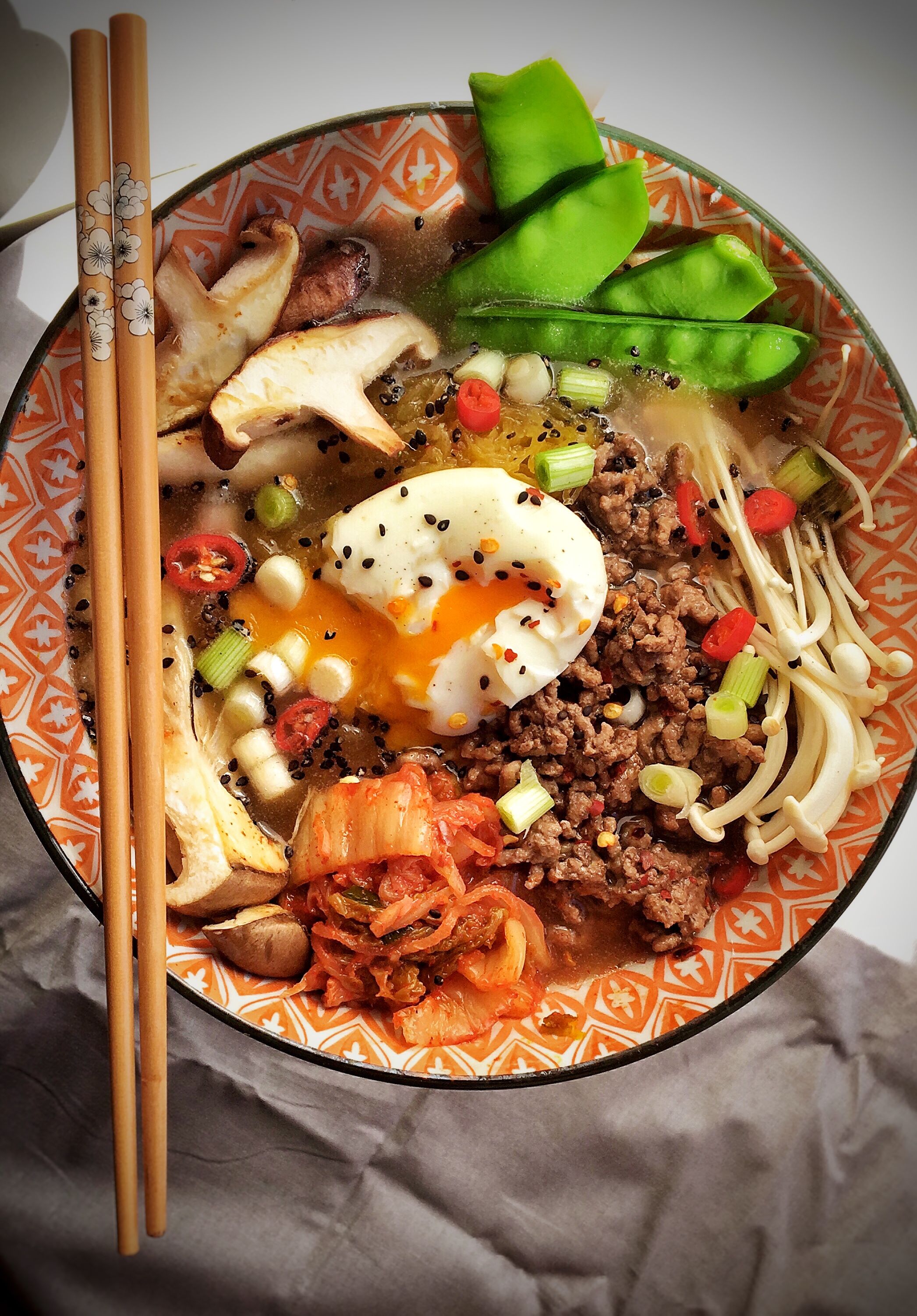 When your broth tastes pretty dam delicious, take the pan off the heat and start scrapping the noodles from around the squash skin and place into bowls pouring as much of the broth into the bowl as you wish. Add in your fillings as well as some added extras like kimchi and a poached egg. You can always add a raw egg, given its straight away as the heat from the broth will cook the yolk and white making it safe to eat.