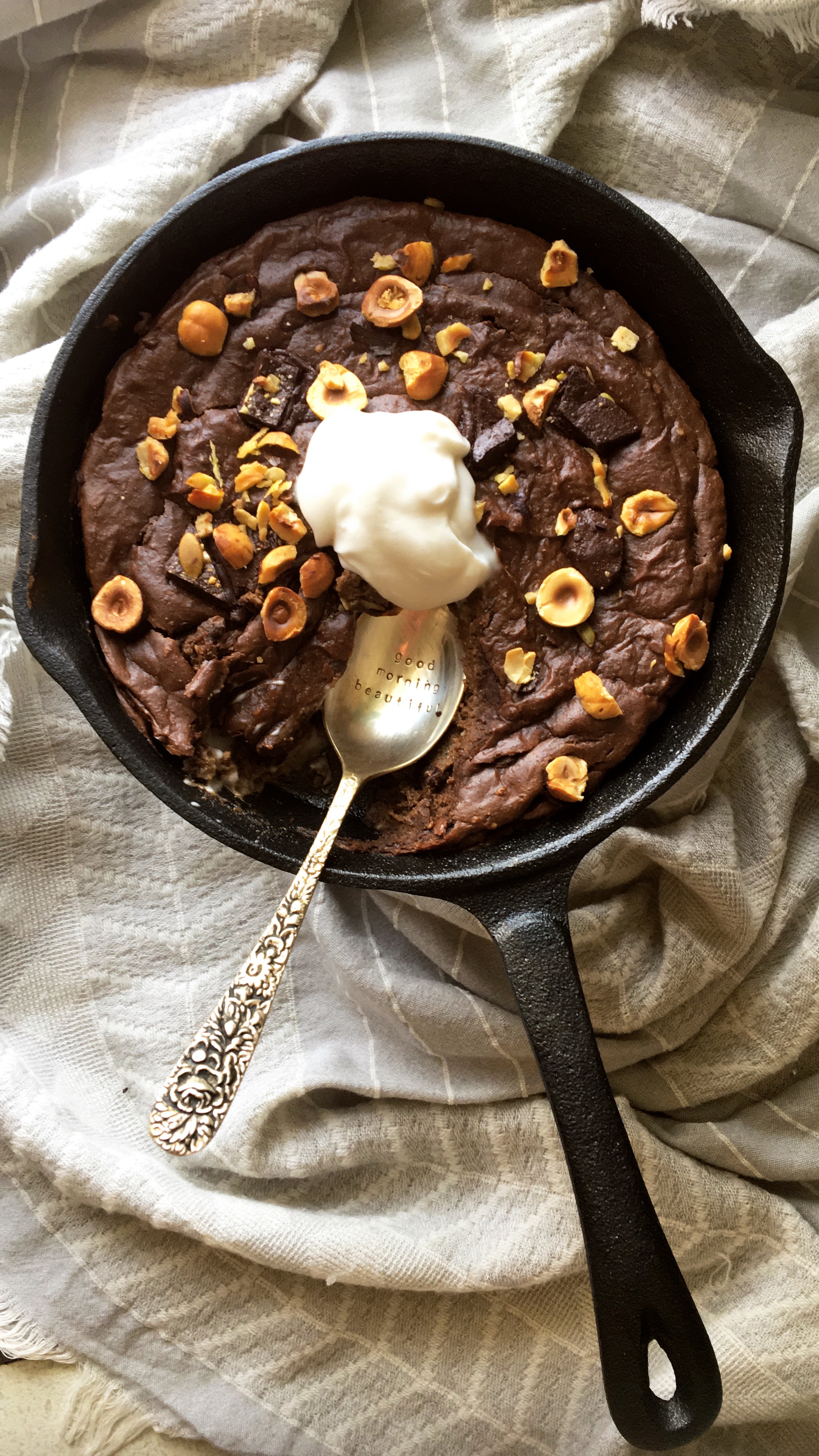 You can drizzle melted dark chocolate and chopped hazelnuts over the top of your skillet or use a grater to sprinkle the nuts and chocolate over the top when you first pull the skillet out of the oven so the chocolate melts over the top. THEN, if you want to add extra sweetness you can add maple syrup.