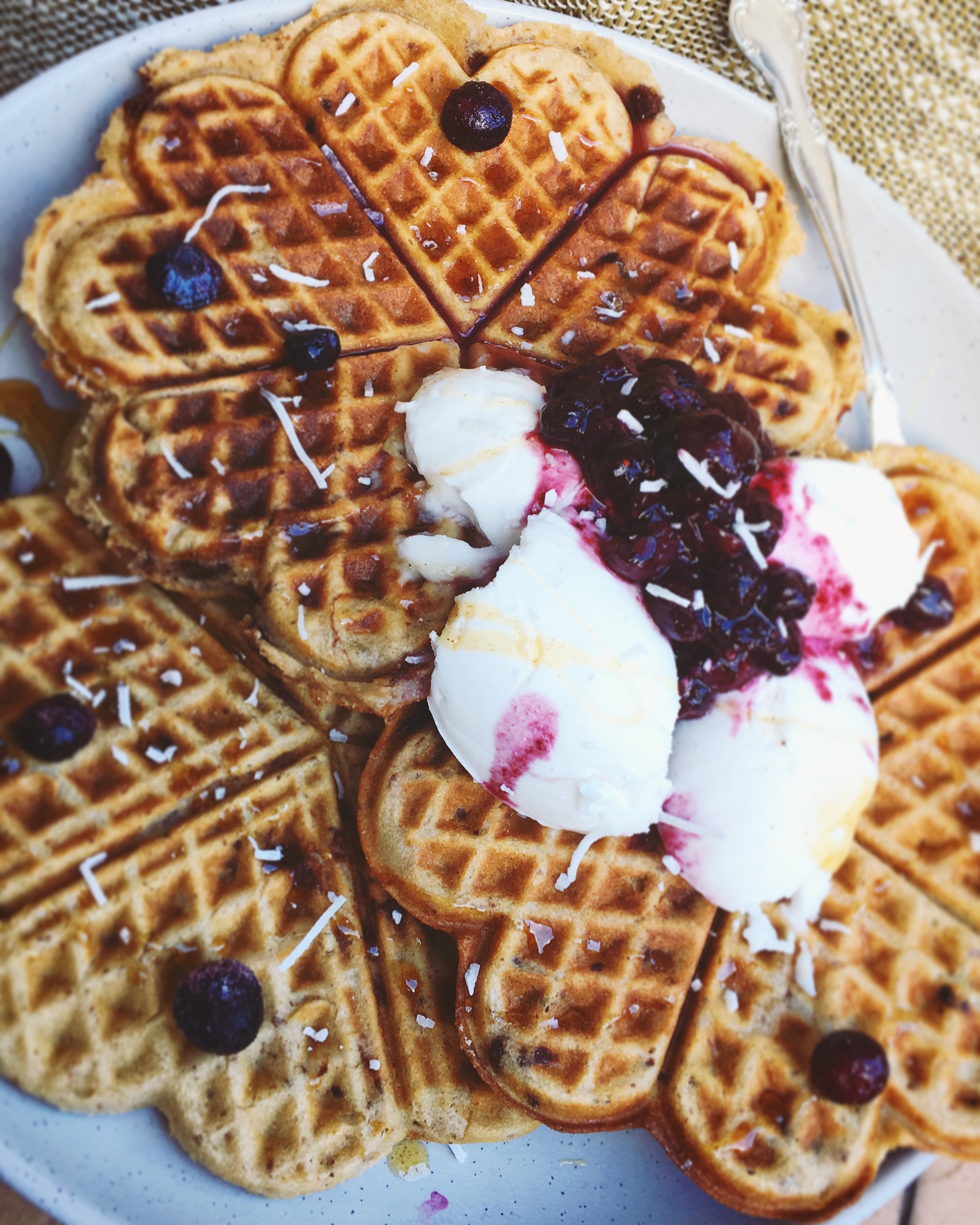 Get creative when you come to decorate and top your waffles, here I have dried coconut strands, COYO coconut ice cream, frozen blueberries and maple syrup.