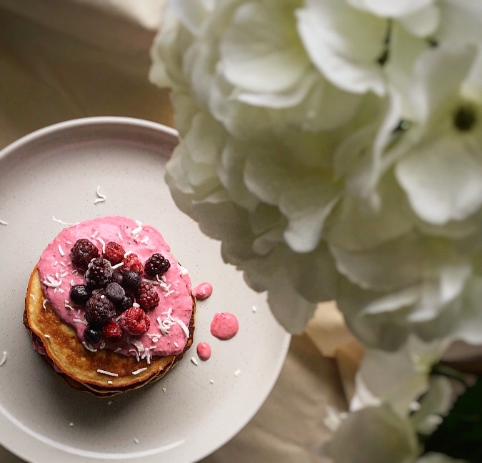 When your pancakes have cooled, stack them up and pour the smoothie mixture over your pancakes, you can decorate as you like, personally I think adding some frozen fruit to the top makes the finished plate look beautiful.
